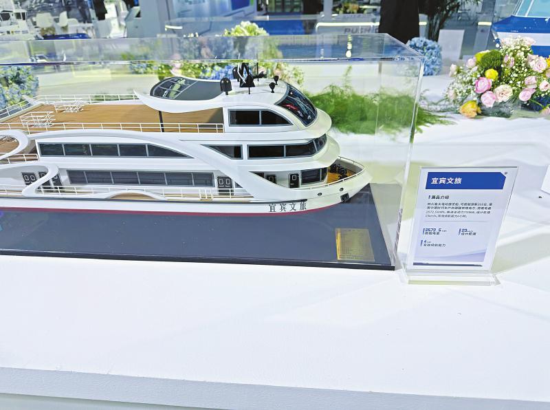 除了上天,动力电池更助力大型船舶“下河”。在电动船舶科技展区,宜宾市交通运输局带来的“宜宾文旅”号新能源游船模型备受关注。