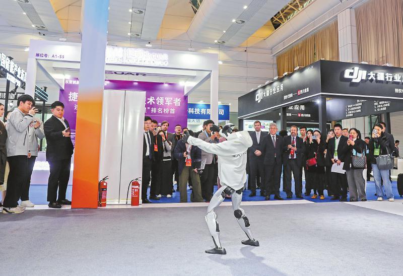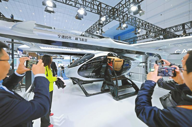 展馆内,宁德时代、锂宝新材料、宜宾中车时代等行业领先企业相继“放大招”。飞行汽车、大模型通用机器人、骁遥双核电池等明星产品相继亮相,吸引不少人参观体验。