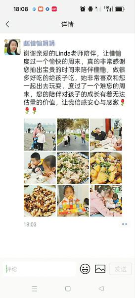 记者从各班老师与家长的微信互动记录中看到,当天家宴活动内容都是以老师陪伴孩子做饭、玩耍为主,不存在补课现象。各班老师可谓“各显神通”:带着学生买菜、做饭,逛公园、学弹吉他,也谈心聊梦想,找问题和不足,并通过文字、图片和视频的方式,同步发给孩子家长。