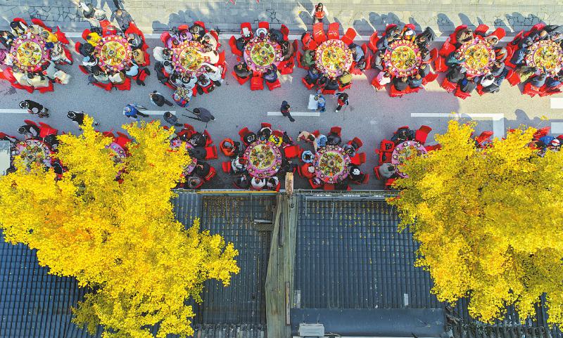 11月20日,汶川县映秀镇的“羌年坝坝宴”开席了,羌族老乡端着咂酒挨桌敬客,各族宾客围坐在一起共同庆祝羌年。