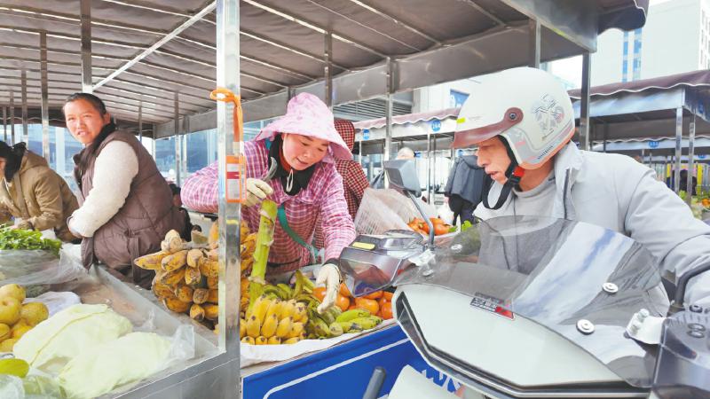 初冬的晨光洒落在凉山州盐源县,丽人街便民菜市已是人声鼎沸,各种新鲜蔬菜吸引了众多顾客。“我们在这里摆摊,不需要交摊位费。”摊主刘雨会说,这些蔬菜都是当天采摘来的。曾经在盐源县街头巷尾流动经营的摊贩,自今年6月起大多集中到了这里,政府相关部门不仅免除他们的摊位费,还提供蔬菜货架,市民的“菜篮子”里装下满满的幸福感。
