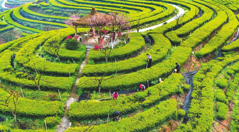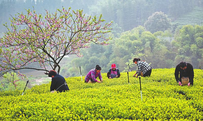 近日,泸州市纳溪区大渡口镇凤凰湖村拂羽茶园,村民忙着采摘春茶。新绽的桃花与嫩绿的茶芽,构成春日诗意的风景。 刘学懿 摄(C视觉)