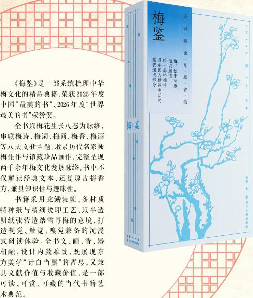 《梅鉴》先于2025年11月荣获2025中国“最美的书”,得到国人认可;又于2026年3月斩获“世界最美的书”荣誉奖,成为四川出版首个完成“国内最美到世界最美”进阶的作品。这恰如王其进所说:“梅,是属于全人类的;美,是超越国界的。”