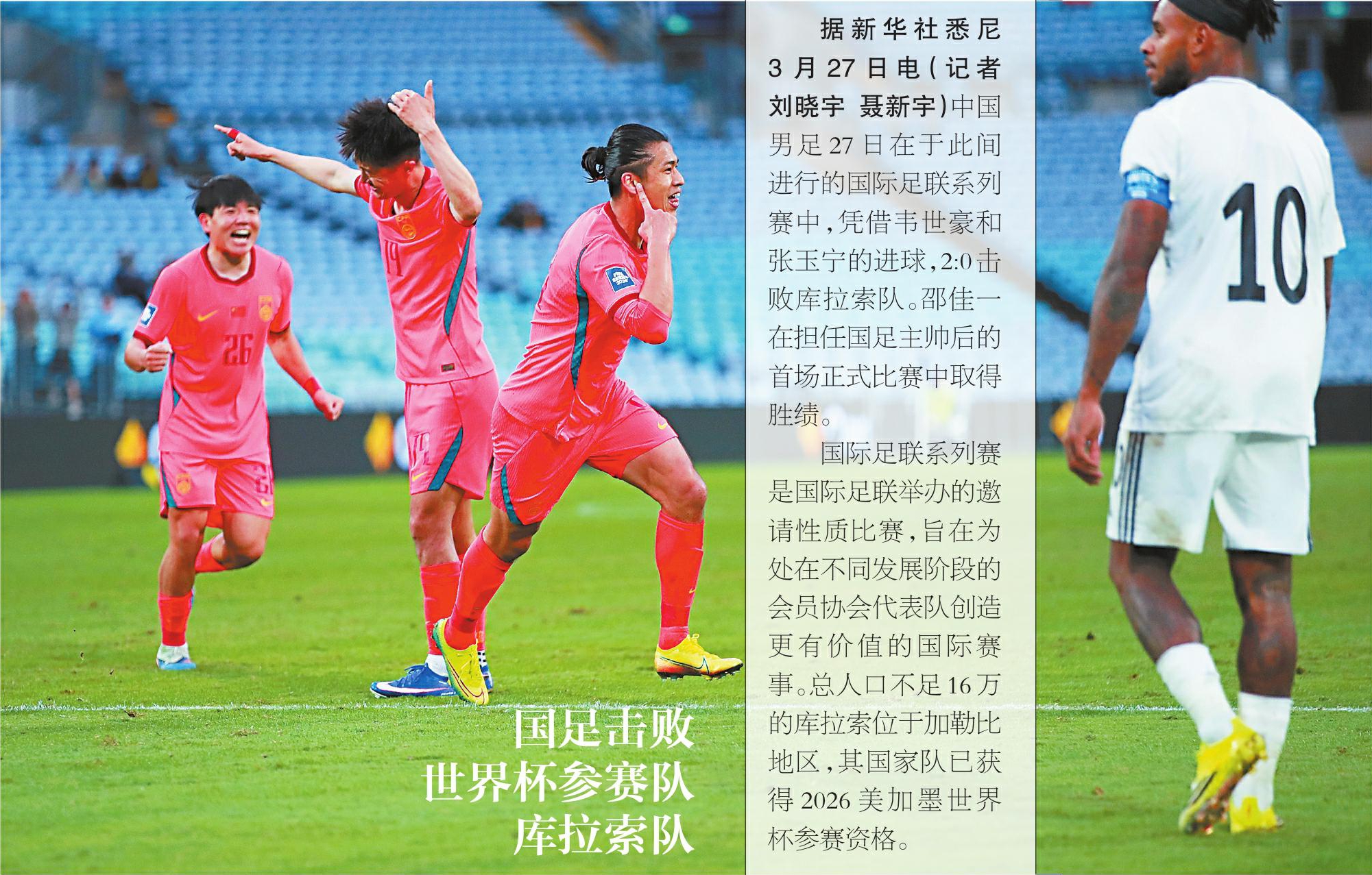 据新华社悉尼3 月 27 日电(记者刘晓宇 聂新宇)中国男足27日在于此间进行的国际足联系列赛中,凭借韦世豪和张玉宁的进球,2:0击败库拉索队。邵佳一在担任国足主帅后的首场正式比赛中取得胜绩。 国际足联系列赛是国际足联举办的邀请性质比赛,旨在为处在不同发展阶段的会员协会代表队创造更有价值的国际赛事。总人口不足16万的库拉索位于加勒比地区,其国家队已获得2026美加墨世界杯参赛资格。