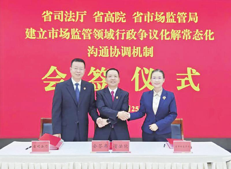 会议通报了2019年至2023年市场监管行政执法、复议、审判工作情况,联合发布市场监管领域行政执法、行政复议、行政审判十大典型案例,三方签署《关于建立市场监管领域行政争议化解常态化沟通协调机制的意见》。