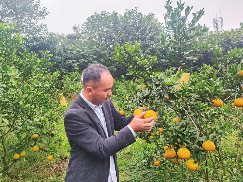 10月28日上午,在雁江区南津镇山友家庭农场的柑橘园里,农场负责人魏忠建正在查看柑橘的长势,并不时与技术人员交流。
