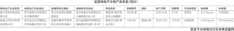 涉及四川的有2批次不合格样品,分别是四川省成都伊藤洋华堂有限公司华府大道店销售的、标称四川省乐山市峨眉山天然有机茶业有限公司生产的峨眉山毛峰(高山红茶),其中水胺硫磷残留量不符合食品安全国家标准规定;四川省眉山市东坡区菊韵副食店销售的、标称四川省眉山市好好食品有限公司生产的香酥饼(油炸类食品)(紫薯味),其中苋菜红检验值不符合食品安全国家标准规定。
