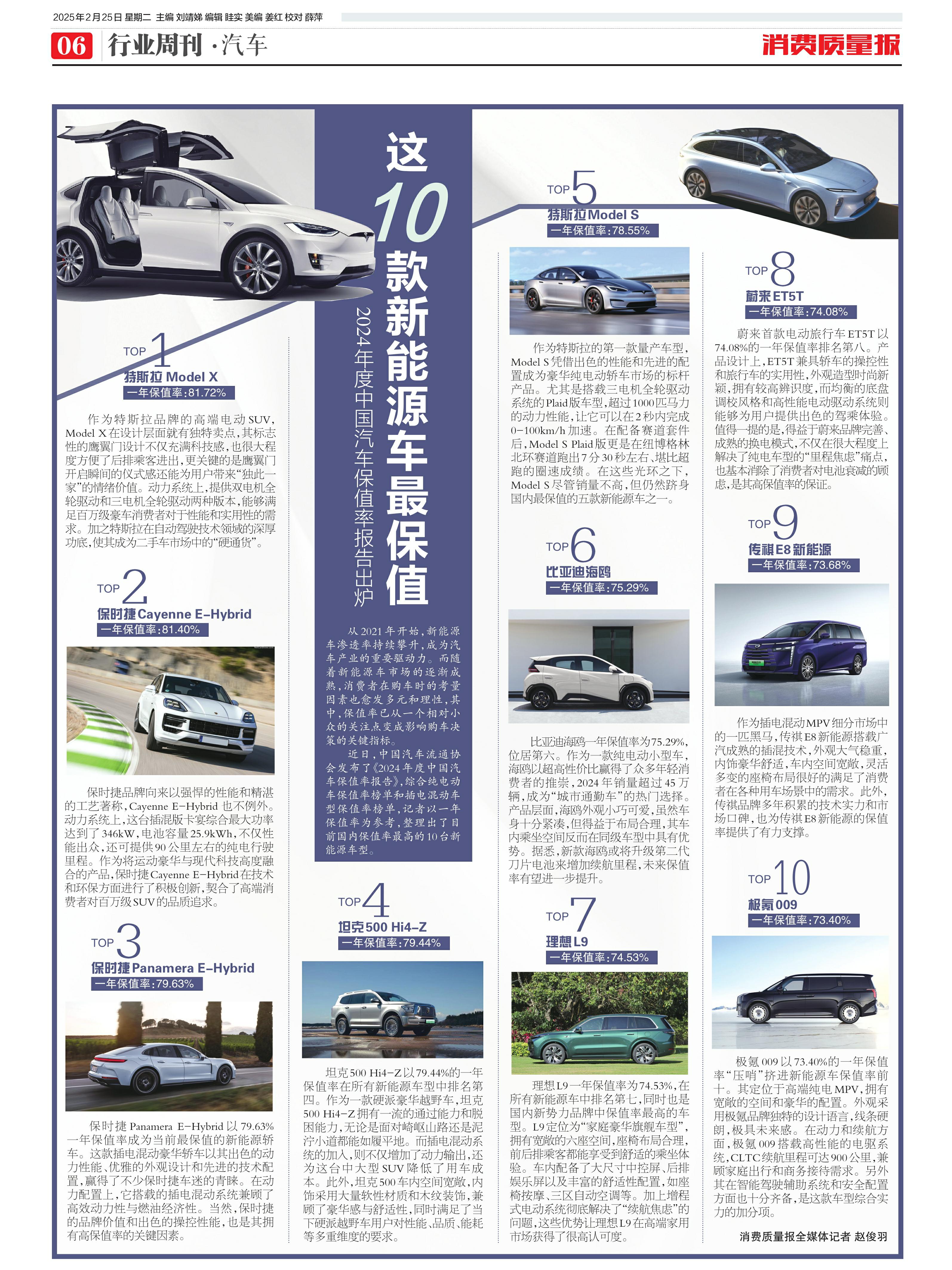 极氪009以73.40%的一年保值率“压哨”挤进新能源车保值率前十。其定位于高端纯电MPV,拥有宽敞的空间和豪华的配置。外观采用极氪品牌独特的设计语言,线条硬朗,极具未来感。在动力和续航方面,极氪009搭载高性能的电驱系统,CLTC续航里程可达900公里,兼顾家庭出行和商务接待需求。另外其在智能驾驶辅助系统和安全配置方面也十分齐备,是这款车型综合实力的加分项。消费质量报全媒体记者 赵俊羽