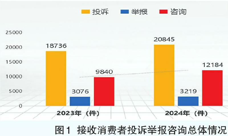 2024年,全市市场监管部门共接到消费投诉举报咨询36248件,与去年同期相比增加4596件,同比上升14.52%。其中,接到消费者投诉20845件,与去年同期相比增加2109件,同比上升11.26%,为消费者挽回经济损失739.68万元;接到举报3219件,与去年同期相比增加143件,同比上升4.65%;接收群众咨询12184件,与去年同期相比增加2344件,同比上升23.82%(如图1所示)。