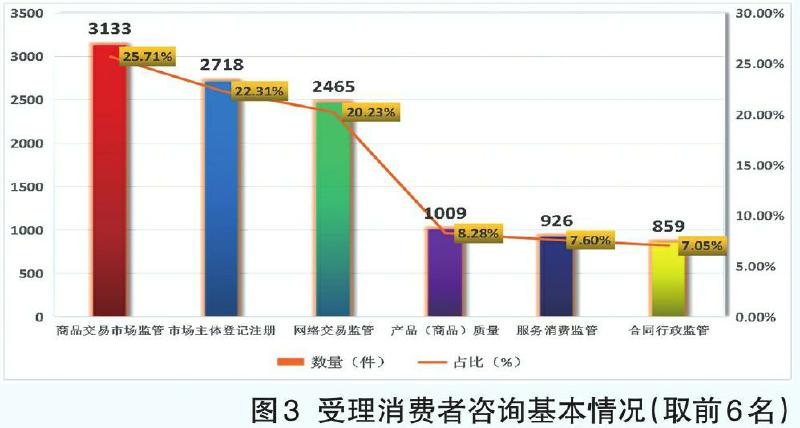 2024年全市共接收消费者咨询12184件,同比上升23.82%。从咨询问题的类别来看,咨询量较大的问题主要有商品交易市场监管3133件、市场主体登记注册2718件、网络交易监管2465件、产品(商品)质量1009件、服务消费监管926件、合同行政监管859件,合计占比91.19%(如图3所示)。