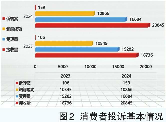 2024年,共接收投诉20845件,受理16684件,同比上升9.17%;按时初查率99.99%,按时办结率100%,调解成功10866件,同比上升3.04%,调解成功率65.13%;“诉转案”159件,同比上升50%。其中,商品类投诉12651件,与去年同期相比增加1533件,同比上升13.79%;服务类投诉8194件,与去年同期相比上升576件,同比上升7.56%(如图2所示)。