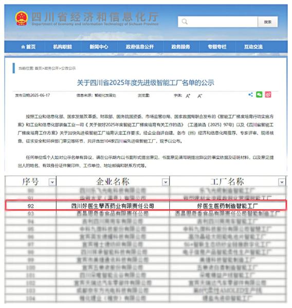 日前,经济和信息化厅正式公布104家四川省2025年度先进级智能工厂名单,好医生攀西药业凭借“好医生医药制造智能工厂”项目成功入选,成为四川省医药健康领域智能化升级的典范。此次认定是四川首次对先进级智能工厂进行认定,企业的入选标志着好医生集团在推动中医药产业数字化转型、提升智能制造水平方面取得重大突破,为传统医药注入了新质生产力。