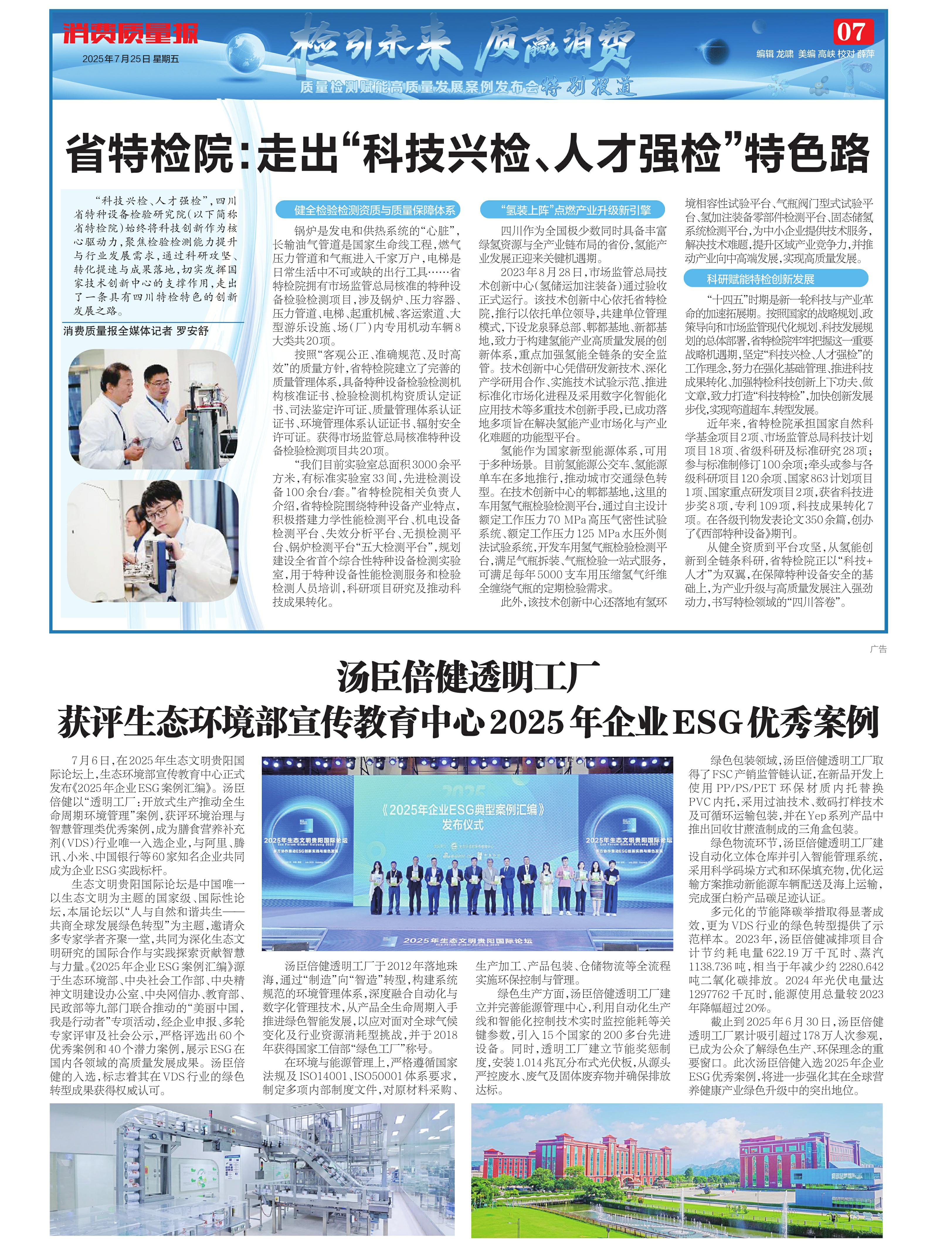7月6日,在2025年生态文明贵阳国际论坛上,生态环境部宣传教育中心正式发布《2025年企业ESG案例汇编》。汤臣倍健以“透明工厂:开放式生产推动全生命周期环境管理”案例,获评环境治理与智慧管理类优秀案例,成为膳食营养补充剂(VDS)行业唯一入选企业,与阿里、腾讯、小米、中国银行等60家知名企业共同成为企业ESG实践标杆。