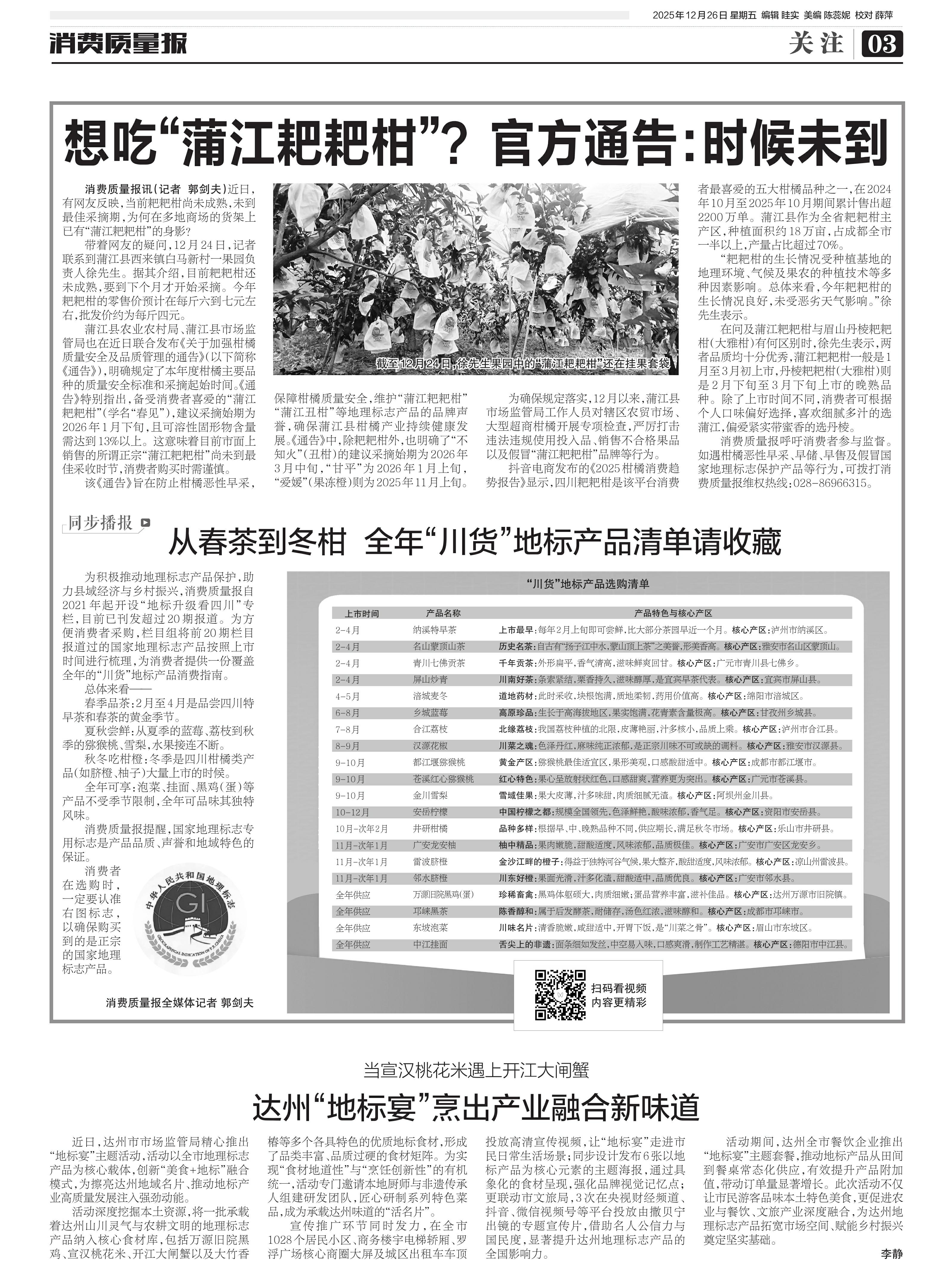 为积极推动地理标志产品保护,助力县域经济与乡村振兴,消费质量报自2021 年起开设“地标升级看四川”专栏,目前已刊发超过20期报道。为方便消费者采购,栏目组将前20期栏目报道过的国家地理标志产品按照上市时间进行梳理,为消费者提供一份覆盖全年的“川货”地标产品消费指南。
